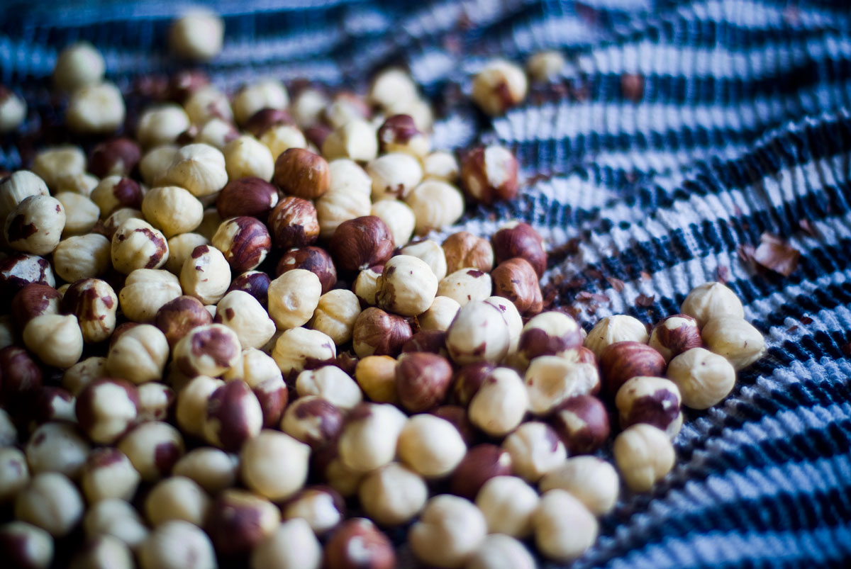 משפשפים את אגוזי הלוז בעזרת מגבת, עד שהקליפה הכהה מתקלפת.