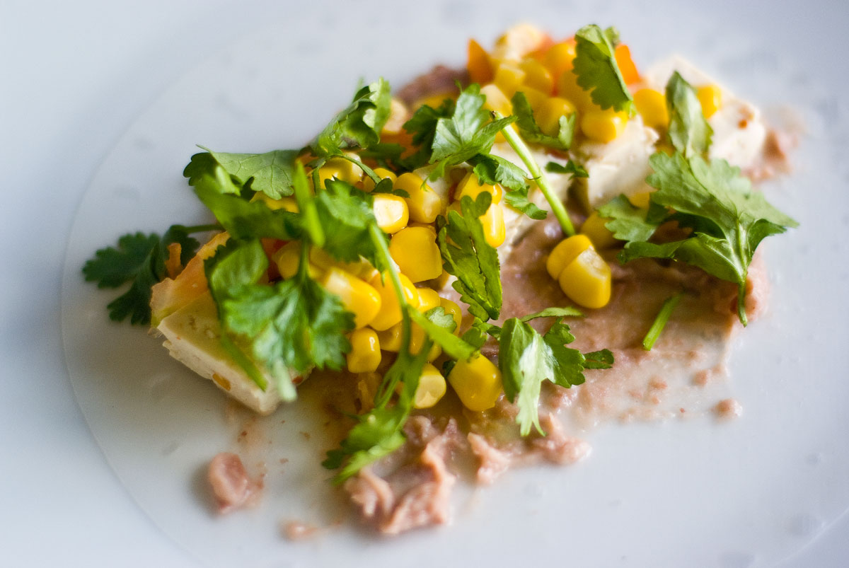 כפית של תירס, מעט עגבניות קצוצות, כוסברה ובצל ירוק